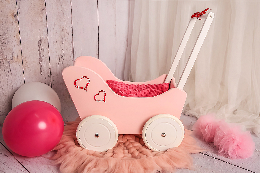 Drewniany wózek dla lalek wykonany z ekologicznych materiałów.