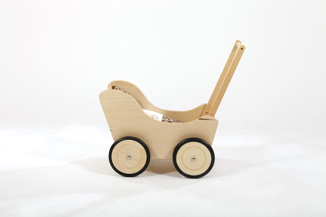 Drewniany wózek dla lalek wykonany z ekologicznych materiałów.