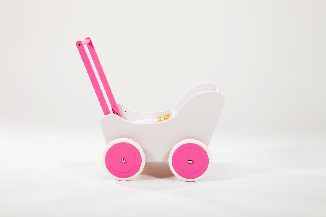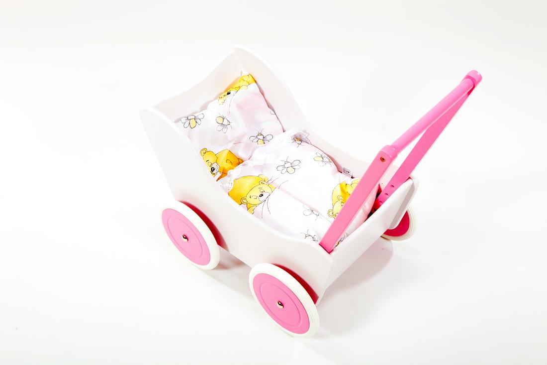 Drewniany wózek dla lalek wykonany z ekologicznych materiałów.
