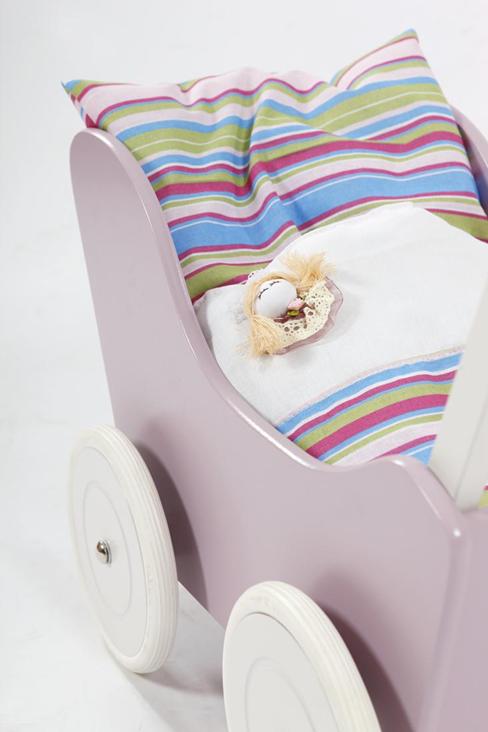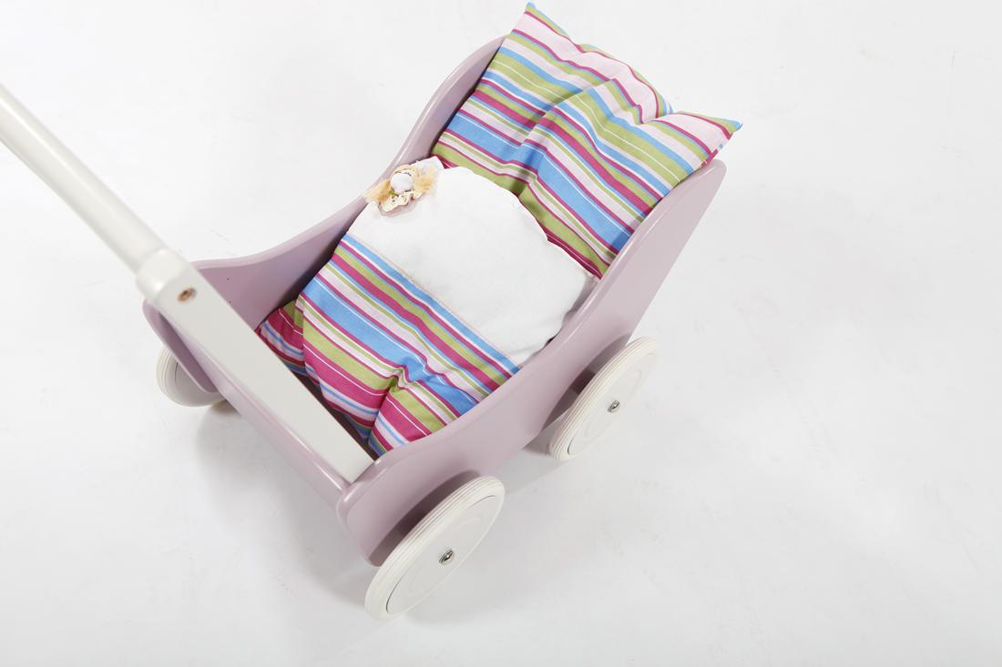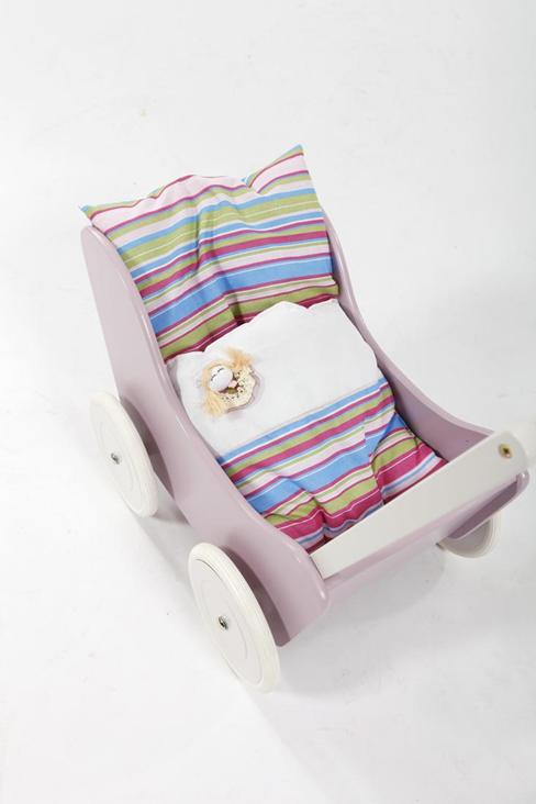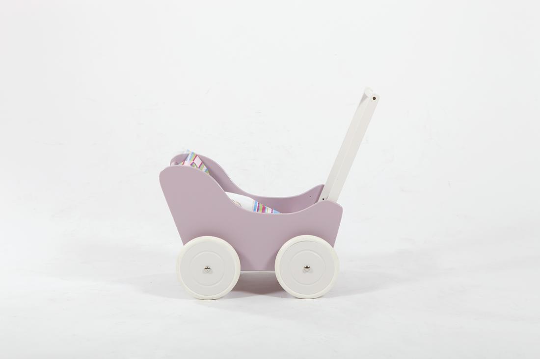 Drewniany wózek dla lalek wykonany z ekologicznych materiałów.