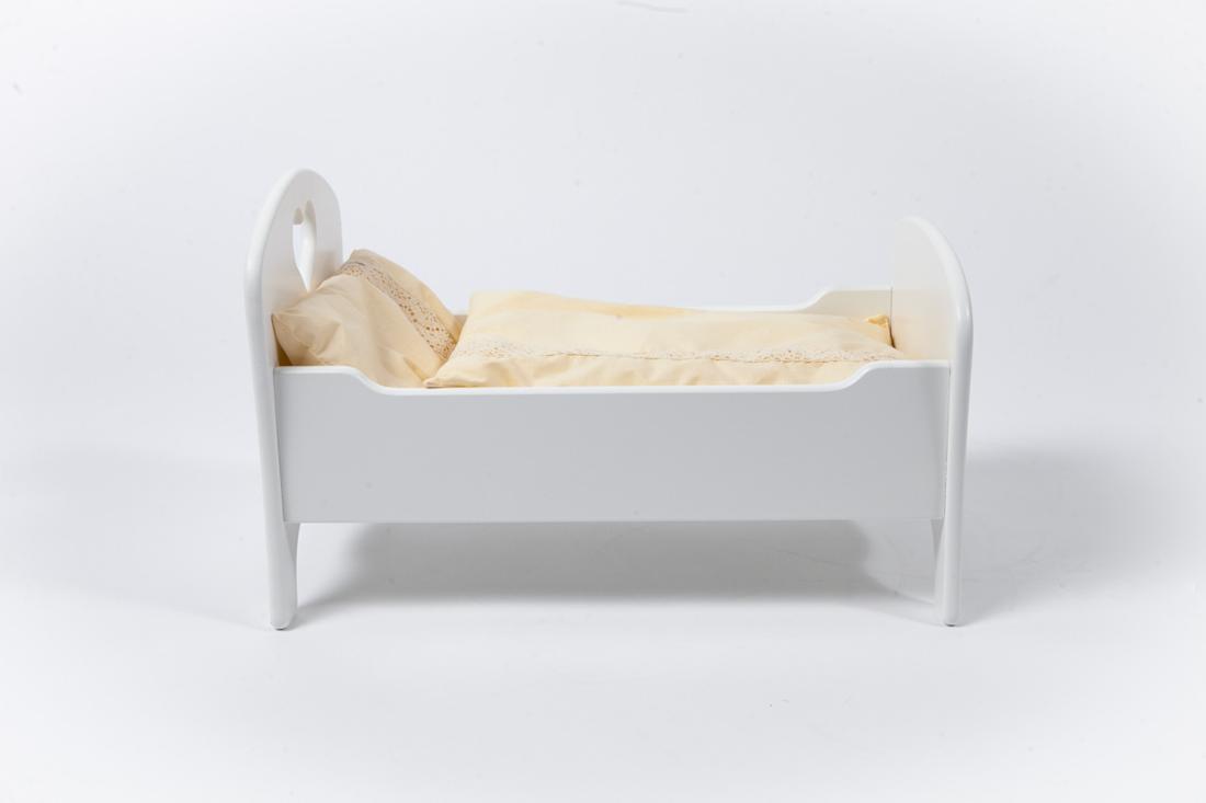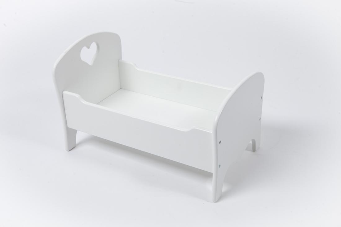 Drewniane łóżeczko dla lalek z serduszkiem.